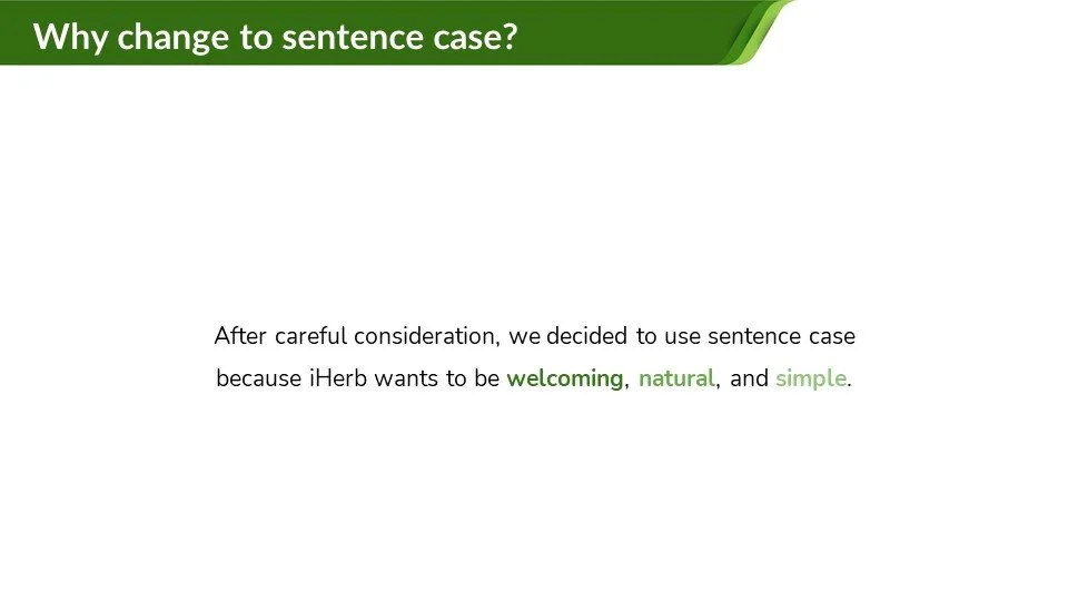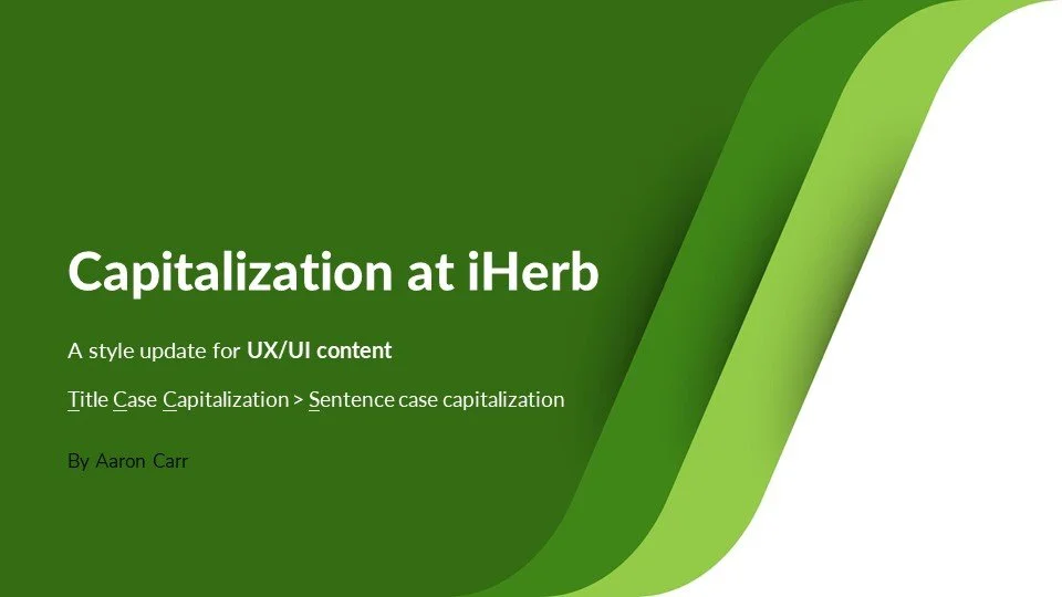 After auditing the content, I also met with designers, marketers, PMs, engineers, and support teams to align on needs and existing concepts of the brand’s voice and style. Below are pages from a pitch deck about shifting iHerb’s content from title case to sentence case capitalization. They agreed and I made the updates in the CMS.