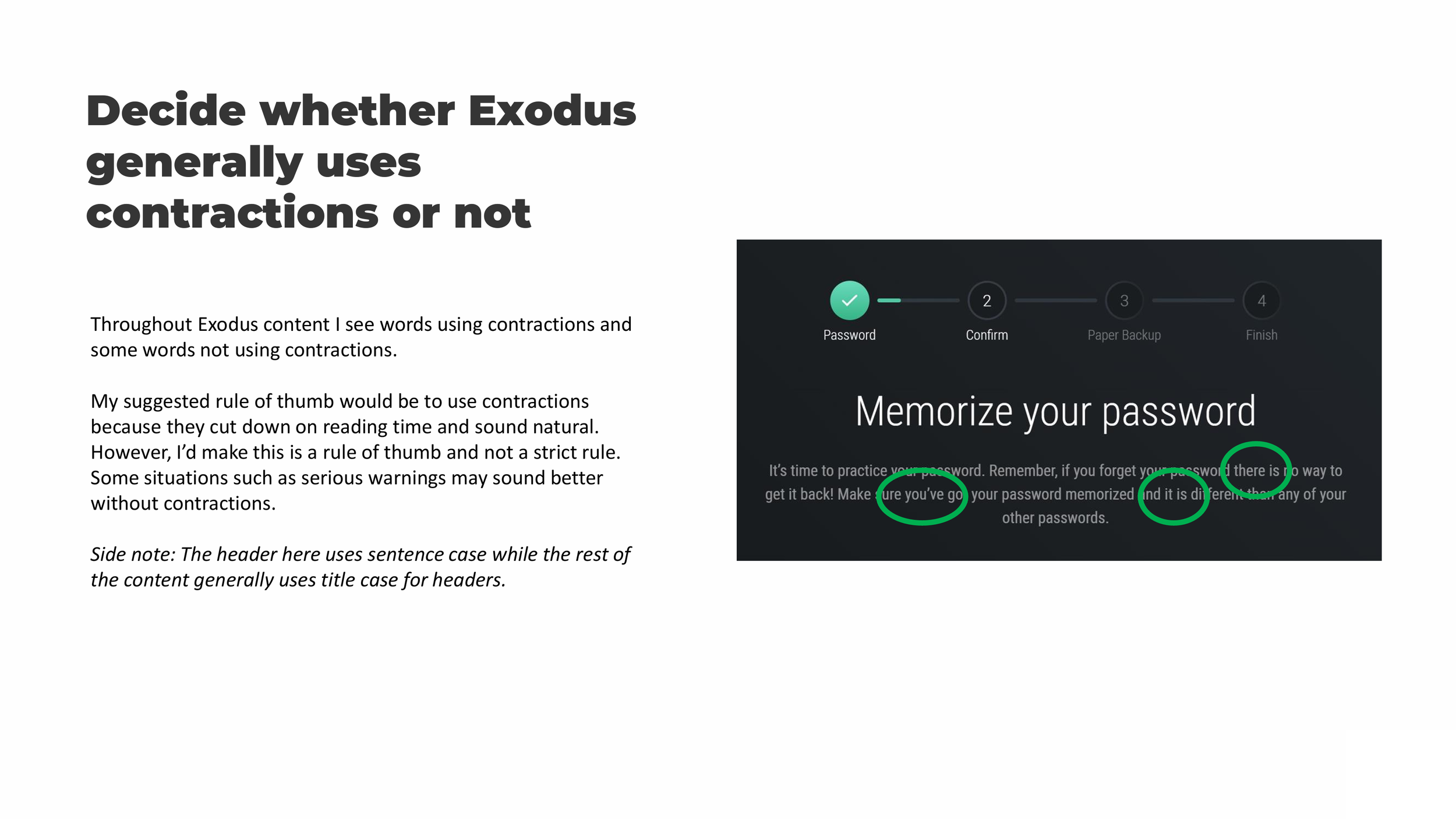 Guidelines: I created rules for voice, tone, grammar, terminology, and reduced-English patterns for non-native speakers